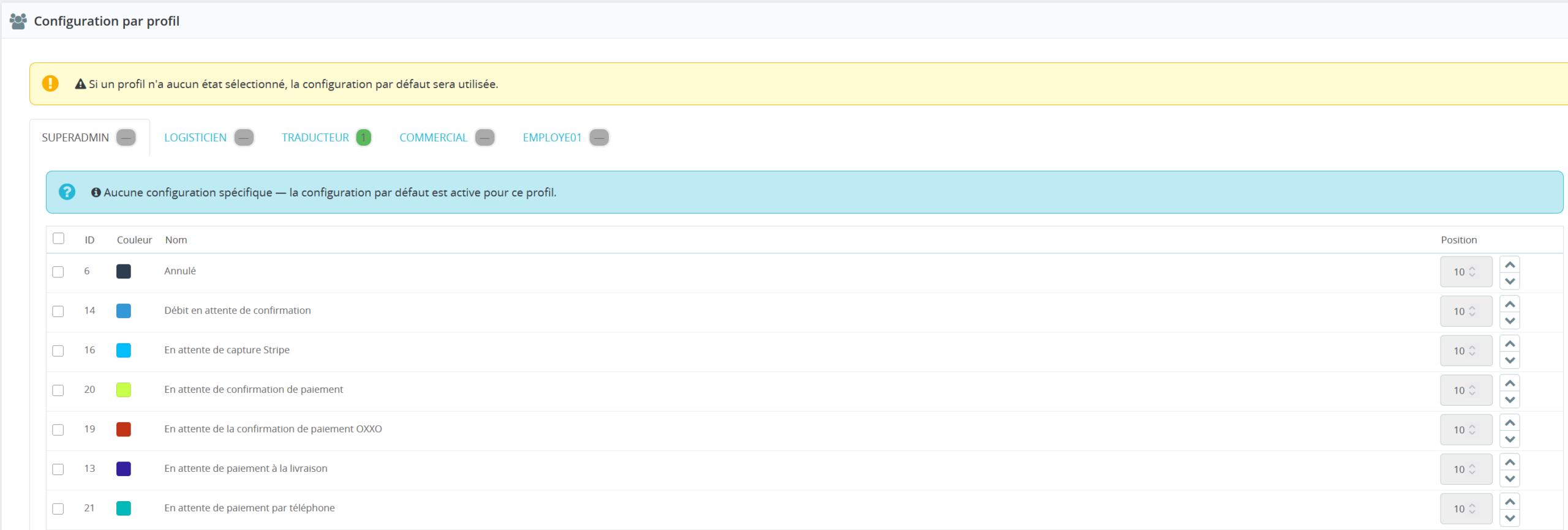 Chaque profil dispose de sa propre configuration (statuts visibles et ordre).